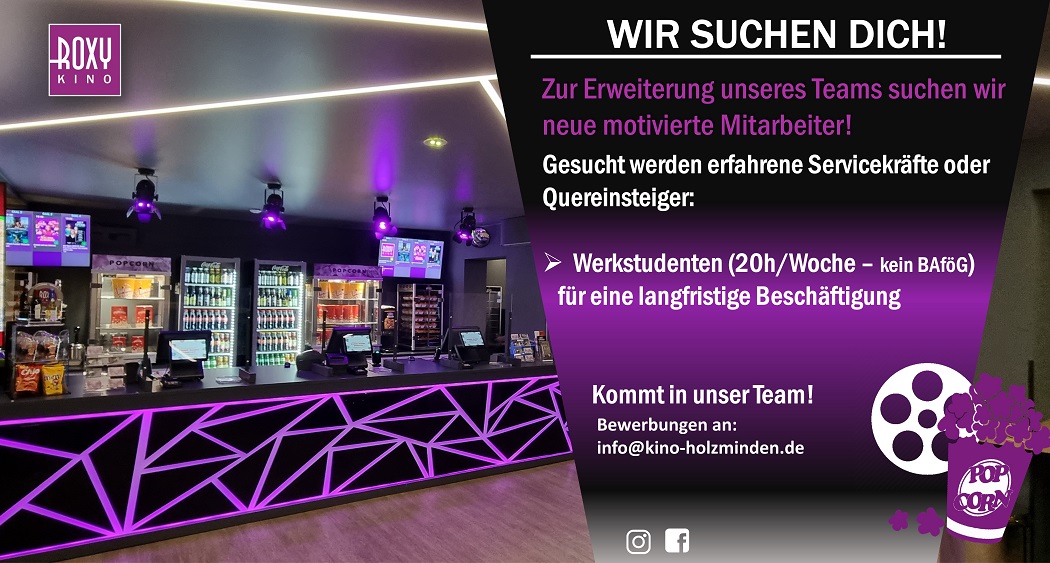 Möchtest DU die Regie in unserem Kino übernehmen? Dann bewirb Dich jetzt und werde ein Teil von unserem ROXY-Team! Wir suchen weiterhin neues Personal, um unser KINO-Team zu erweitern! Schickt uns kurze Bewerbung mit Lebenslauf an: info@kino-holzminden.de Wir freuen uns auf EUCH!